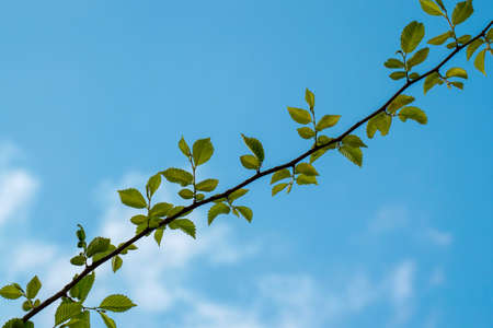 spring leaves blooming on a branch against a blue sky with white clouds and copy space.