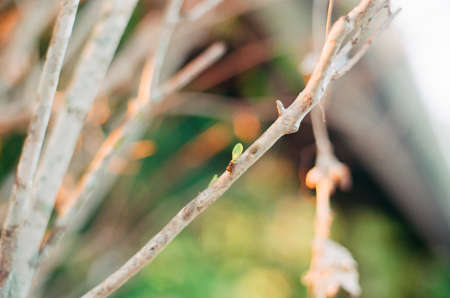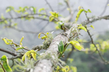 Closeup little plants bud leaves on tree trunk in the forest, green nature background