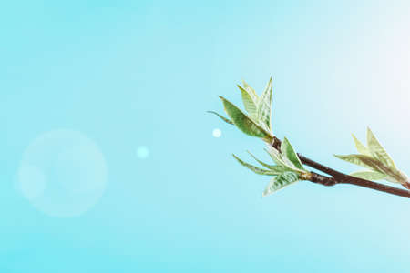 Young twig with fresh leaves on a blurry background. Toned.