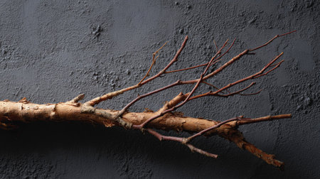 Long dry branch with peeling bark placed against a faded black wall texture, atmospheric and raw
