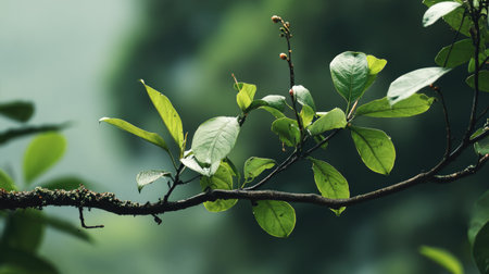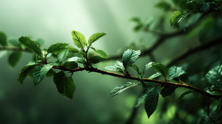 Close-up of vibrant green leaves with dewdrops on a branch in a foggy forest, conveying a sense of tranquility and the beauty of nature's freshness.