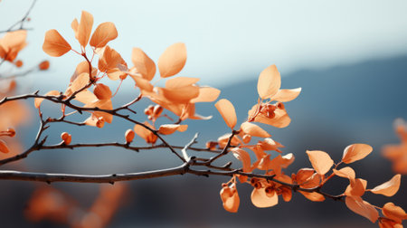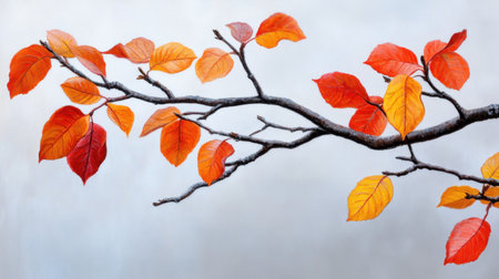 Bare branches reaching out with colorful fall leaves clinging delicately, serene seasonal mood