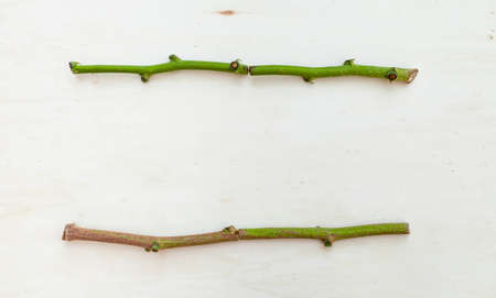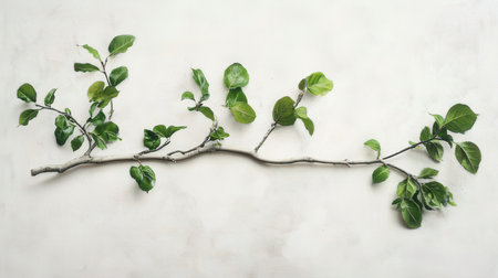 Branch with green leaves on white wall background. Flat lay.