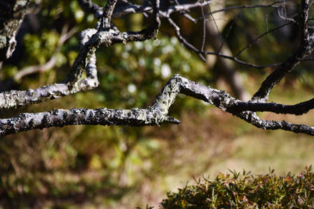 Bark of soursop tree (Annona muricata) with moss or lichen running along its branches. soursop cultivation in Colombia. diseased fruit tree.