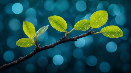 green leaves on a branch, captured in a closeup view, stand out against a light background. this minimalist illustration showcases a blend of light cyan and gray tones, with subtle gradients adding depth. the digitally manipulated image combines elements of oriental minimalism and pseudo-infrared effects, resulting in a realistic yet stylized composition. ai generated