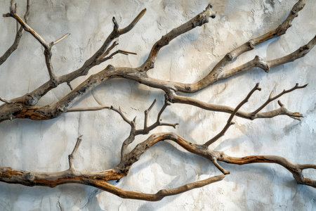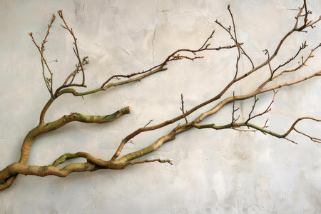 Natural wooden branches on a white, textured wall, creating a tranquil and artistic backdrop