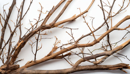 The image shows a close-up of bare tree branches against a white background. The branches are intertwined, creating a complex network of lines and textures. The branches are dry and brittle, with a light brown color. The white background adds a sense of starkness and contrast.