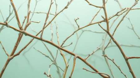 This artistic image showcases intricate twigs and branches intertwined against a soft green background, creating a serene and abstract visual ideal for creative projects and designs.