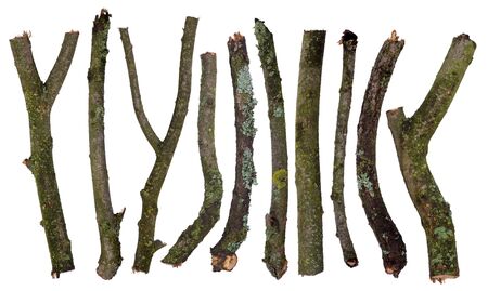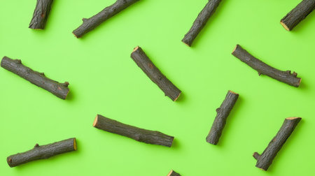 This image features an array of natural sticks and logs scattered across a vibrant green background. Ideal for projects focused on nature, textures, or sustainable themes.
