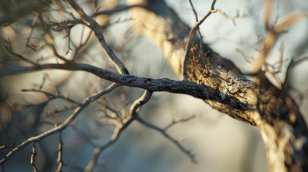 A closeup of a bare tree branch showcases intricate details against a softly blurred green background, symbolizing tranquility and the beauty of nature