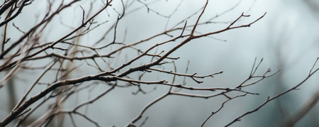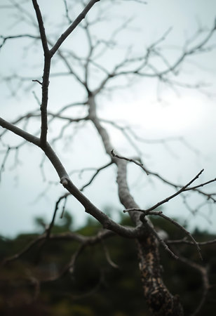 Close-up of twisted bare branches under a dark gray sky, capturing the raw and untamed beauty of nature