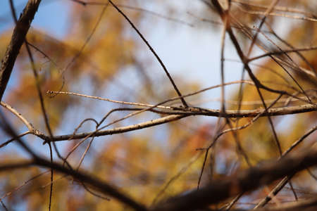 Branches of an old tree on a background of blue sky on a sunny day. Selective focus