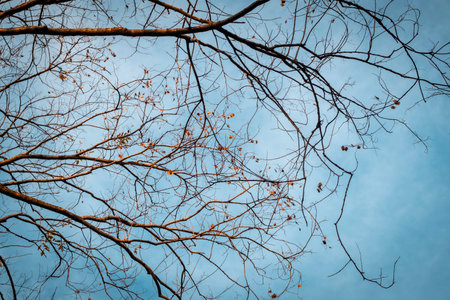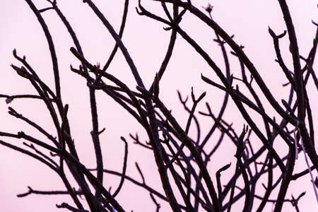 Silhouette of tree branches without leaves on a sky blue background. Customized evening sky with conceptual spider web