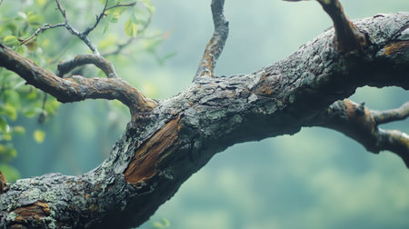 A close-up view of a gnarled tree branch in a misty forest during early morning light showcasing intricate textures and natural beauty
