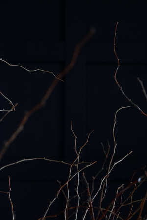 A single dry branch from a dead tree lies on a dark textured background, minimal lighting and sharp shadows for dramatic effect