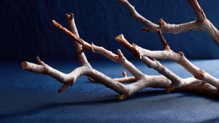 Dead tree branch with sharp angles laid on a deep navy surface, minimal styling for high-contrast look