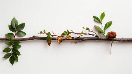 A serene composition featuring a branch adorned with green leaves and striking red berries, set against a clean white background, perfect for natural themes.