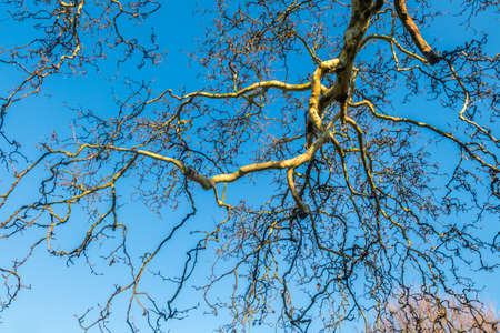 Tree top against blue sky, Detailed of tree branches in the garden in London. Save the Earth concept.
