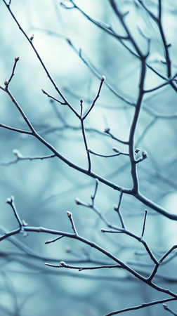 This image features leafless tree branches against a soft blue and teal background, creating a serene and minimalist atmosphere perfect for calming visuals in nature themes.