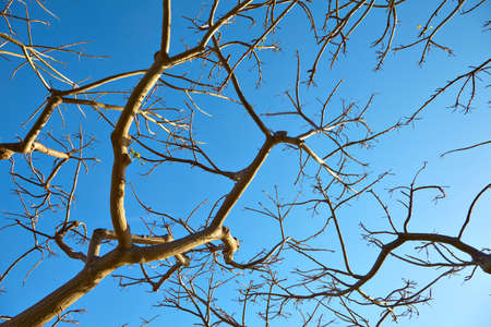 Dead tree isolated on blue sky background, Dead branches of a tree.Dry tree branch.Part of single old and dead tree on blue sky background.