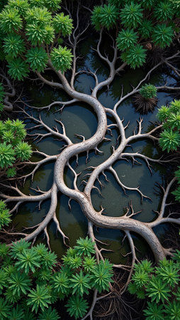 Mysterious mangrove forest with twisting roots and brackish water