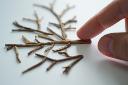 A collection of delicate twigs and branches artfully arranged against a bright blue background, symbolizing nature's beauty and fresh spring vibes, perfect for decorating or design.