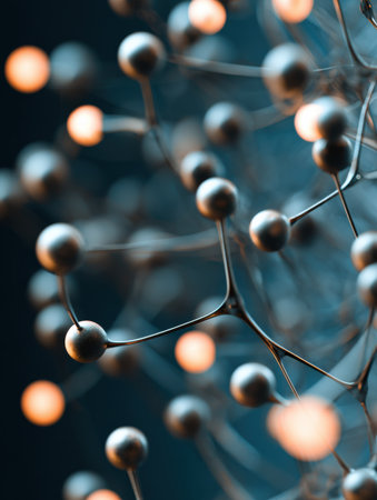 Close view of a molecular structure reveals a network of atoms linked by bonds, illuminated by glowing nodes against a dark backdrop.
