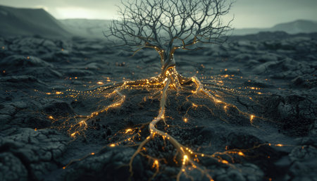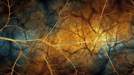 An abstract 3D rendering of a complex, branching network resembling a root system or neural pathways. Golden lines with glowing nodes spread across a dark, textured surface, symbolizing concepts like artificial intelligence, data networks, connectivity, and biological systems.