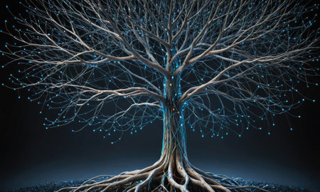 This abstract illustration features intricate blue branching structures set against a dark backdrop. The artwork showcases a complex network of lines and forms, creating a visually compelling design. Its color palette and style lend themselves well to various commercial uses, including website design, advertising, and editorial content.