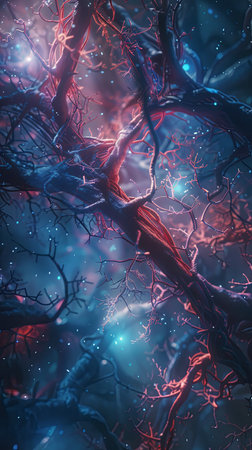 A close-up view of a realistic, detailed nerve network with blue and red glowing lights, creating a mystical and ethereal atmosphere.