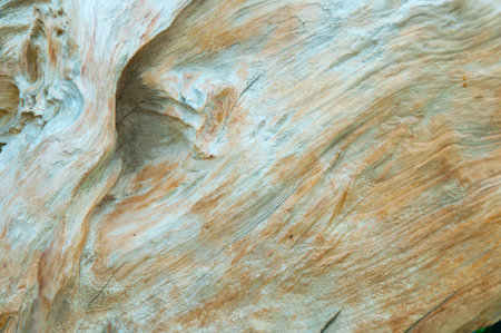 This image showcases a detailed close-up of aged wood, revealing complex textures and organic shapes. The natural color palette features various shades of brown and beige, highlighted by the intricate grain patterns. It suggests a sense of age and natural decay. Ideal for illustrating concepts related to nature and design elements in commercial projects.