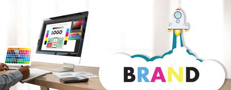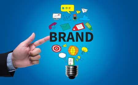Man holding yellow card and word BRAND. Brand building for success concept