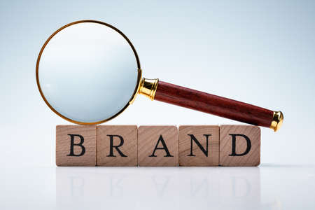Close-up Of Magnifying Glass And Wooden Brand Block Against Reflective Background