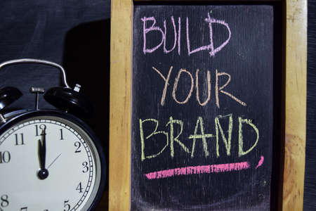 Build your brand on phrase colorful handwritten on blackboard. Education and business concept. Alarm clock, chalk, books on black background