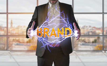 Business man making electricity light BRAND word bolt from his hands concept