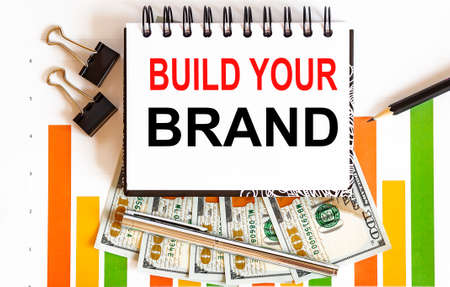 BUILD YOUR BRAND text on white background with chart, pencil and dollars