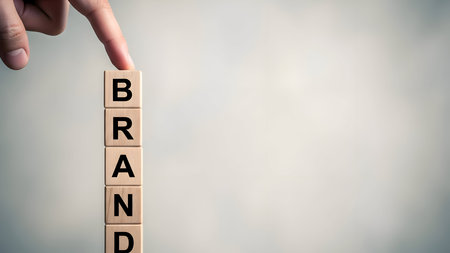 Human finger tapping on the letter 'b' of wooden blocks spelling 'brand' vertically, symbolizing business identity, strategy, and development.