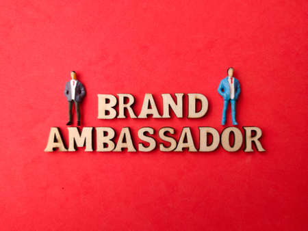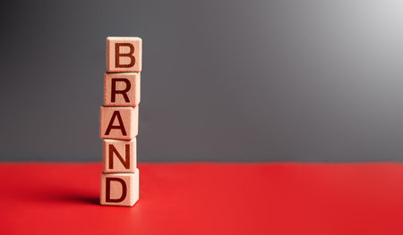Wooden cube block with BRAND business word on red table and gray background. Marketing, Advertising, Product development and Brand building for success concept