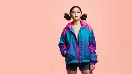 Young girl with bright face makeup on pink background. Girl dressed in a vintage sports windbreaker
