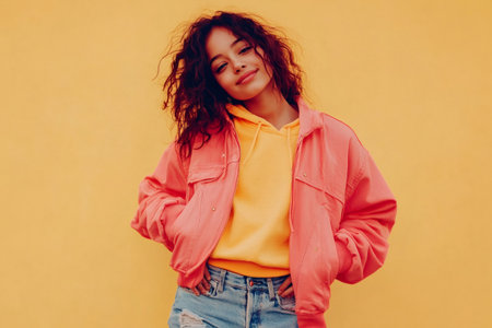 Fashionable teenager with pink jacket and yellow hoodie posing in front of a vibrant yellow wall, showing a trendy and youthful style