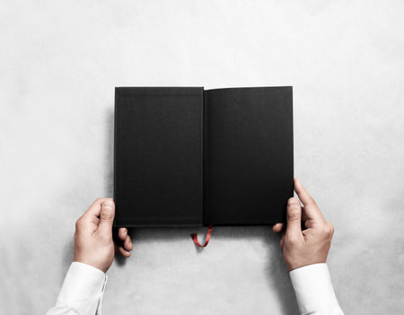 Hand holding blank opened book mock up with black half title. Person reading empty paperback mockup. Black notebook inside template. Publication design leafing man. Textbook spread with bookmark.