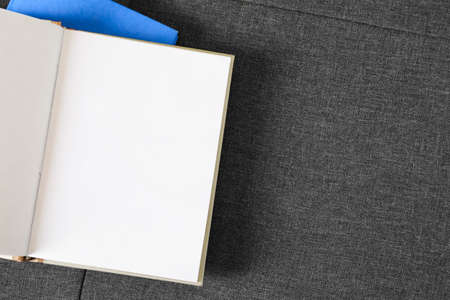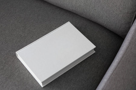 Book with blank cover and empty cover on a gray sofa