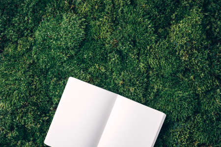 Craft notebook, white sketch book on fresh spring green grass, moss background. Copy space. Top view. Wild nature, ecology concept. Summer forest. Sustainable, organic, zero waste lifestyle