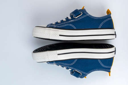 a pair of blue sneakers on a white background. Fashionable youth shoes