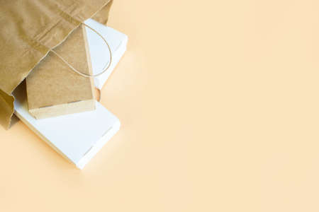 Delivery of food at home, in eco boxes and packages on a light background. Place for text