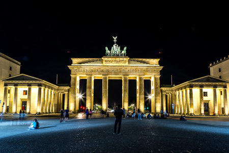 BERLIN, GERMANY - AUGUST 26, 2017; Historic Brandenburg Gate and four horses bronze statue illuminated at night against dark black sky