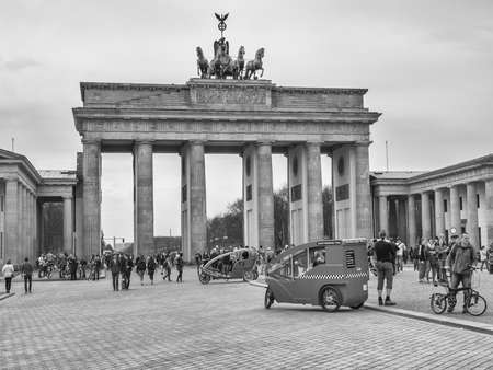 BERLIN, GERMANY - CIRCA JUNE 2016: Tourists in front of Brandenburger Tor meaning Brandenburg Gate in black and white