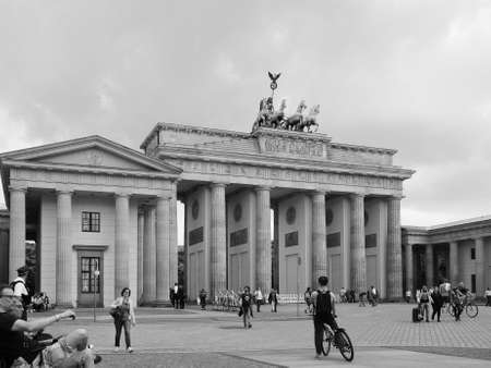 BERLIN - JULY 09, 2017: The famous symbol of Berlin - Brandenburg vorotama and Pariser Platz. Black and white.