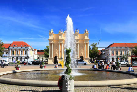 Potsdam, Germany - September 18, 2020: Visiting Potsdam and the Brandenburg Gate on a sunny day in September. View from the field side on the Luisenplatz at the western entrance to the old town.