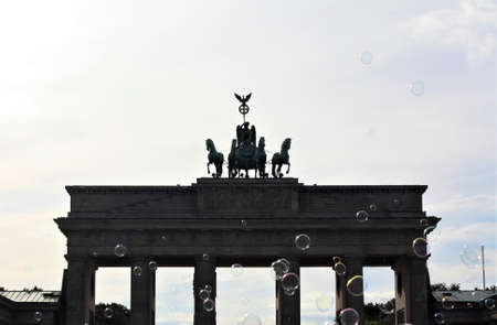detail of Brandenburg gate, Berlin late afternoon with bubbles blowing past, no people